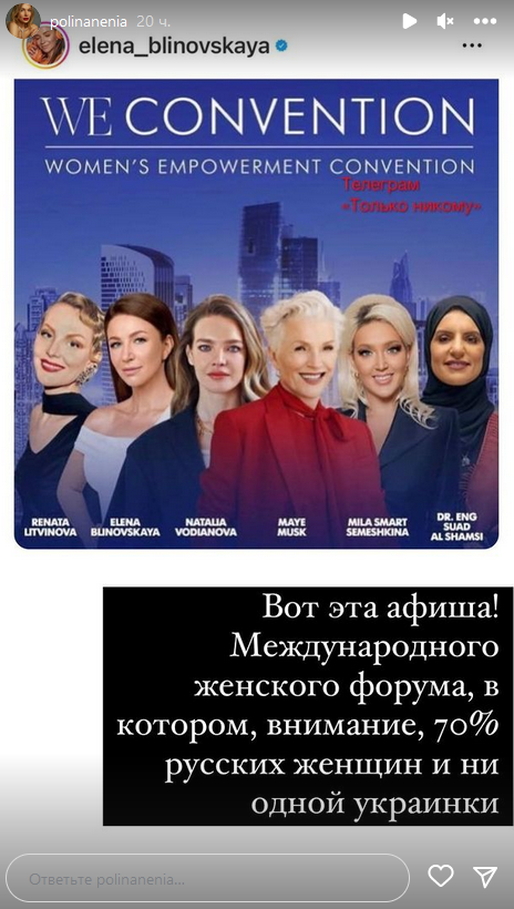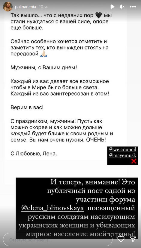 Внимание на это обратила украинская телеведущая Полина Неня. Она опубликовала у себя в "сториз" скриншот поста россиянки, посвященного "Дню защитника отечества", который та опубликовала незадолго до публикации афиши форума в ОАЭ.