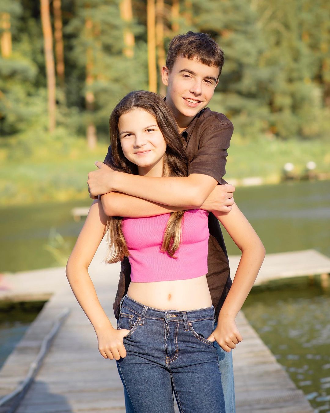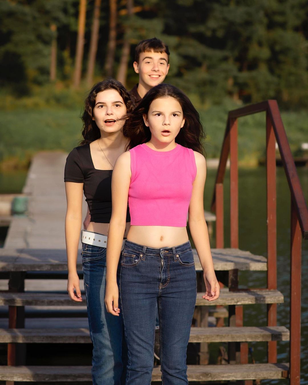 На красочных снимках Падалко запечатлена с 16-летним Михаилом, 15-летней Марией и 13-летней Екатериной. Семья позирует на деревянном мостике посреди озера на фоне зеленого леса.
