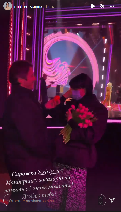 Ведущие обнимались, что-то друг другу нашептывали, а потом Притула вручил Ефросининой мандаринку. Маша пошутила, что засахарит ее в память об этом моменте.