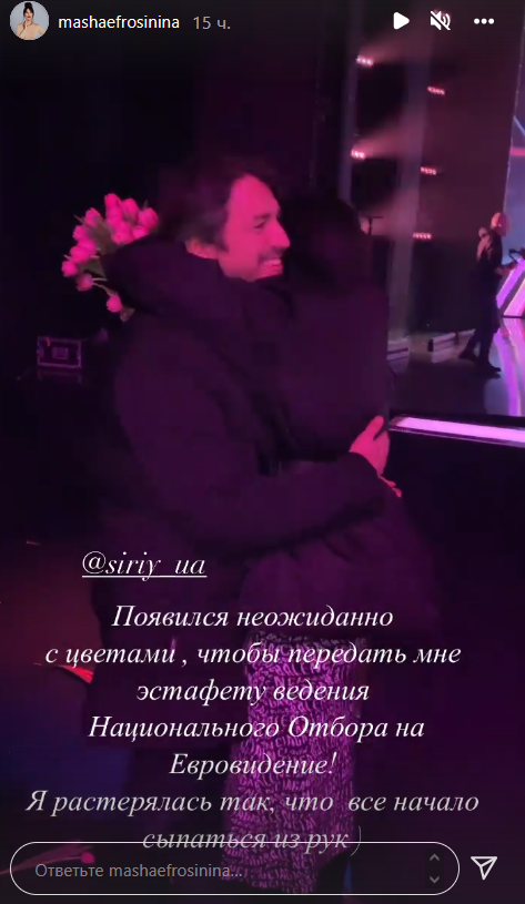 Маша Ефросинина, которая вместе с Тимуром Мирошниченко будет вести отбор, поделилась в Instagram-историях кадрами из закулисья и показала сюрприз от Сергея Притулы - неизменного ведущего Нацотбора в предыдущие годы. Телеведущая отметила, что ей давно никто не делал таких приятностей.