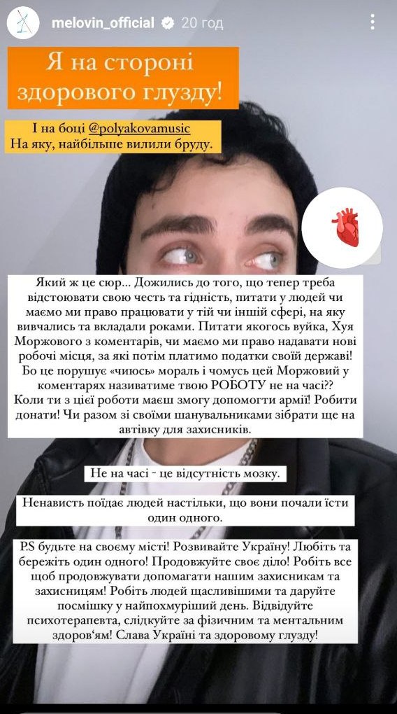 "Какой же это сюр... Дожились до того, что теперь надо отстаивать свою честь и достоинство, спрашивать у людей, имеем ли мы право работать в той или другой сфере, на которую учились и вкладывались годами. Спрашивать какого-то вуйка, Х*я Моржового с комментариев, имеем ли мы право предоставлять новые рабочие места, за которые потом платим налоги своему государству. Потому что это нарушает "чью-то" мораль и почему-то этот Моржовый в комментариях будет называть твою работу не ко времени? Когда ты с этой работы имеешь возможность помогать армии! Делать донаты! Или вместе со своими поклонниками собрать еще на автомобиль для защитников", - пишет Melovin.