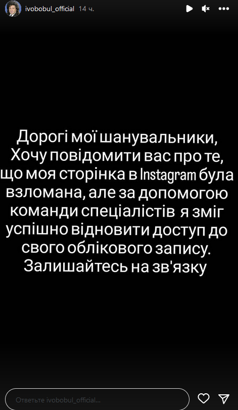 После скандального интервью Эмме Антонюк на странице Иво Бобула в Instagram появилась публикация с извинениями в адрес женщин, которых он назвал "меркантильными". Однако певец заявил, что не писал этот текст, а его страницу в соцсети взломали. Спустя короткое время народный артист сообщил, что восстановил персональный профиль, после чего выложил пост, где прокомментировал сексистский скандал.