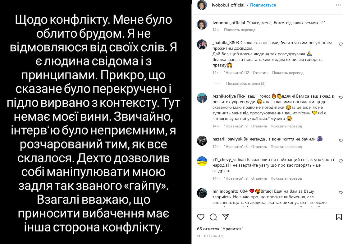 "Относительно конфликта. Меня было облито грязью. Я не отказываюсь от своих слов. Я человек сознательный и с принципами. Обидно, что сказанное было перекручено и подло вырвано из контекста. Здесь нет моей вины. Конечно, интервью было неприятным, я разочарован тем, как все сложилось. Некоторые позволили себе манипулировать мной ради так называемого "хайпа". Вообще считаю, что приносить извинения должна другая сторона конфликта", - написал Иво Бобул на своей официальной странице.