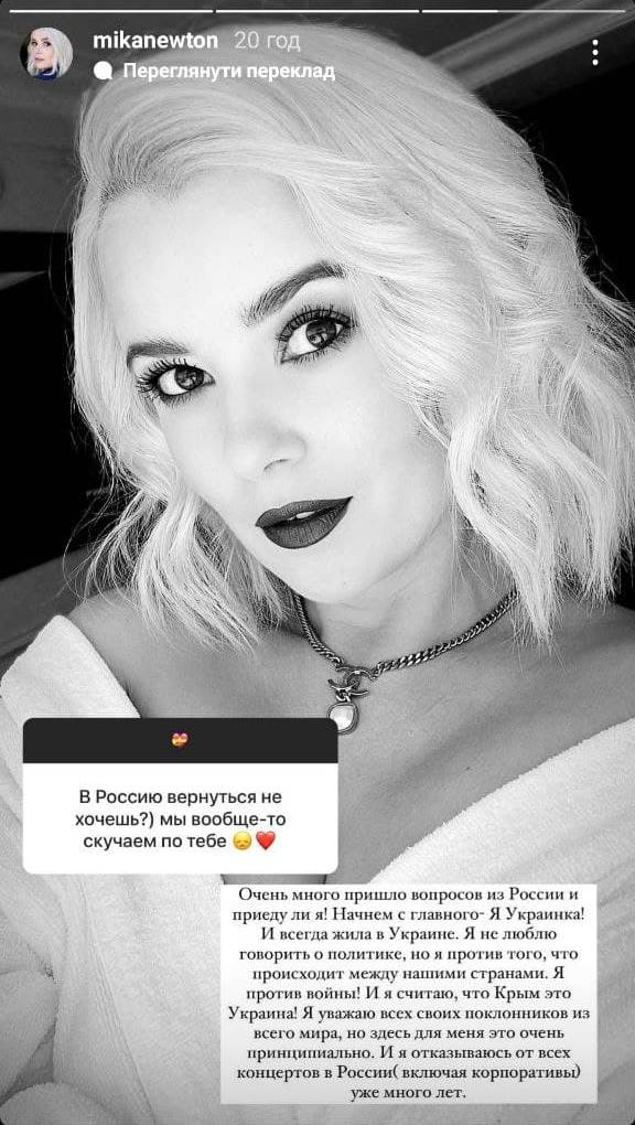 Об этом Ньютон, которая представляла Украину на "Евровидении-2011", написала в "сториз", отвечая на очередной вопрос о визите в Россию. "Я уважаю всех своих поклонников из разных уголков мира, но в этом вопросе я принципиальная, - ответила певица. - Я отказываюсь от всех выступлений в России (включая корпоративы) уже много лет".