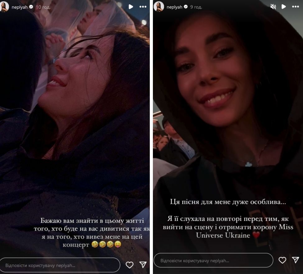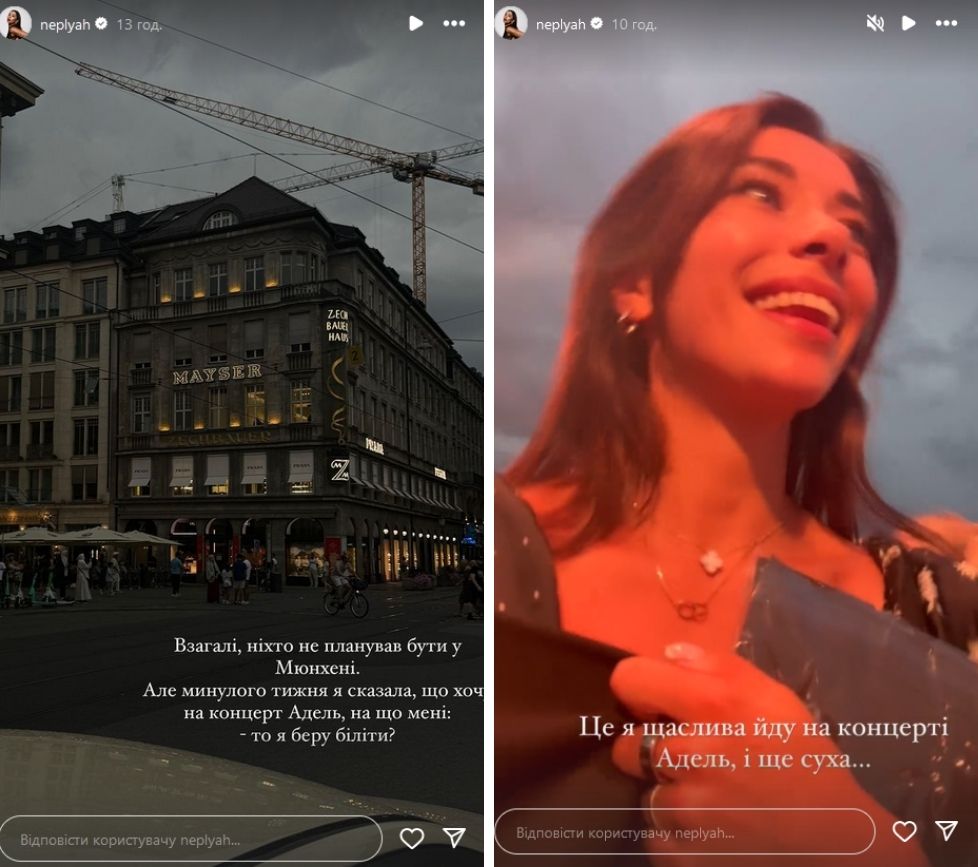На личной странице в Instagram представительница нашей страны на конкурсе "Мисс Вселенная-2021" похвасталась кадрами с немецкого выступления Адель и призналась, что поездка на концерт была спонтанной. "Вообще, никто не планировал быть в Мюнхене. Но на прошлой неделе я сказала, что хочу на концерт Адель, на что мне: тогда я беру билеты?", - рассказала Неплях, намекнув, что ее желание выполнил любимый, личность которого она не раскрывает.