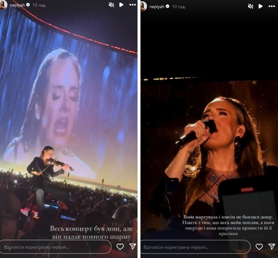 Неплях рассказала, что Адель со сцены шутила и не боялась проливного дождя. "Даже с тем, что весь мейк поплыл, а ноги замерзли и она попросила принести ей ее кроссовки", - отметила она.