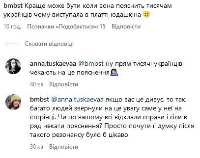 Подписчицы в комментариях порадовались за девушку, что она осуществила свою мечту, а одна из них напомнила Анне некрасивый поступок Адель по отношению к Украине. "Лучше может быть, когда она объяснит тысячам украинцев, почему выступала в платье Юдашкина", - написала пользовательница соцсети, вызвав дискуссию.