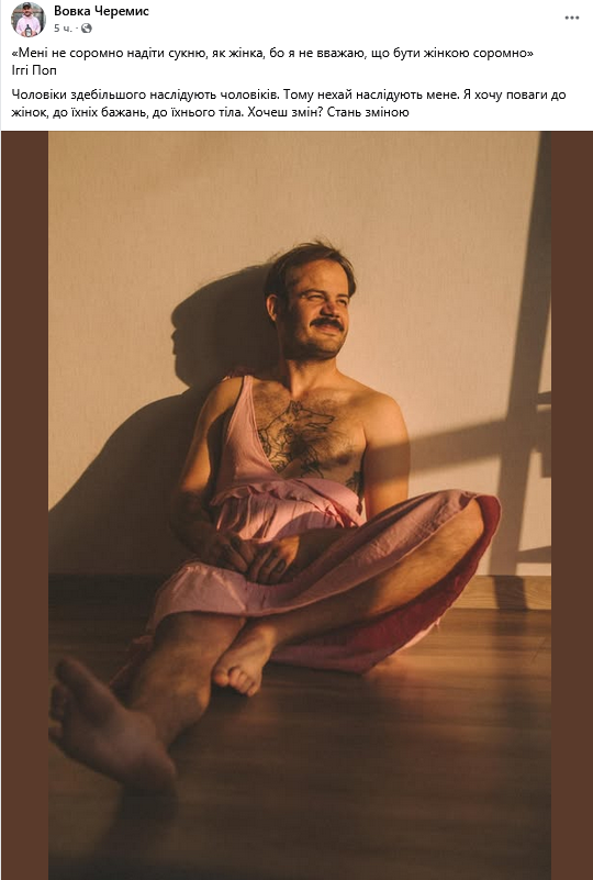 Также привел цитату американского рок-певца, одного из основателей и гуру альтернативного года Игги Попа: "Мне не стыдно надеть платье, как женщина, потому что я не считаю, что быть женщиной стыдно".