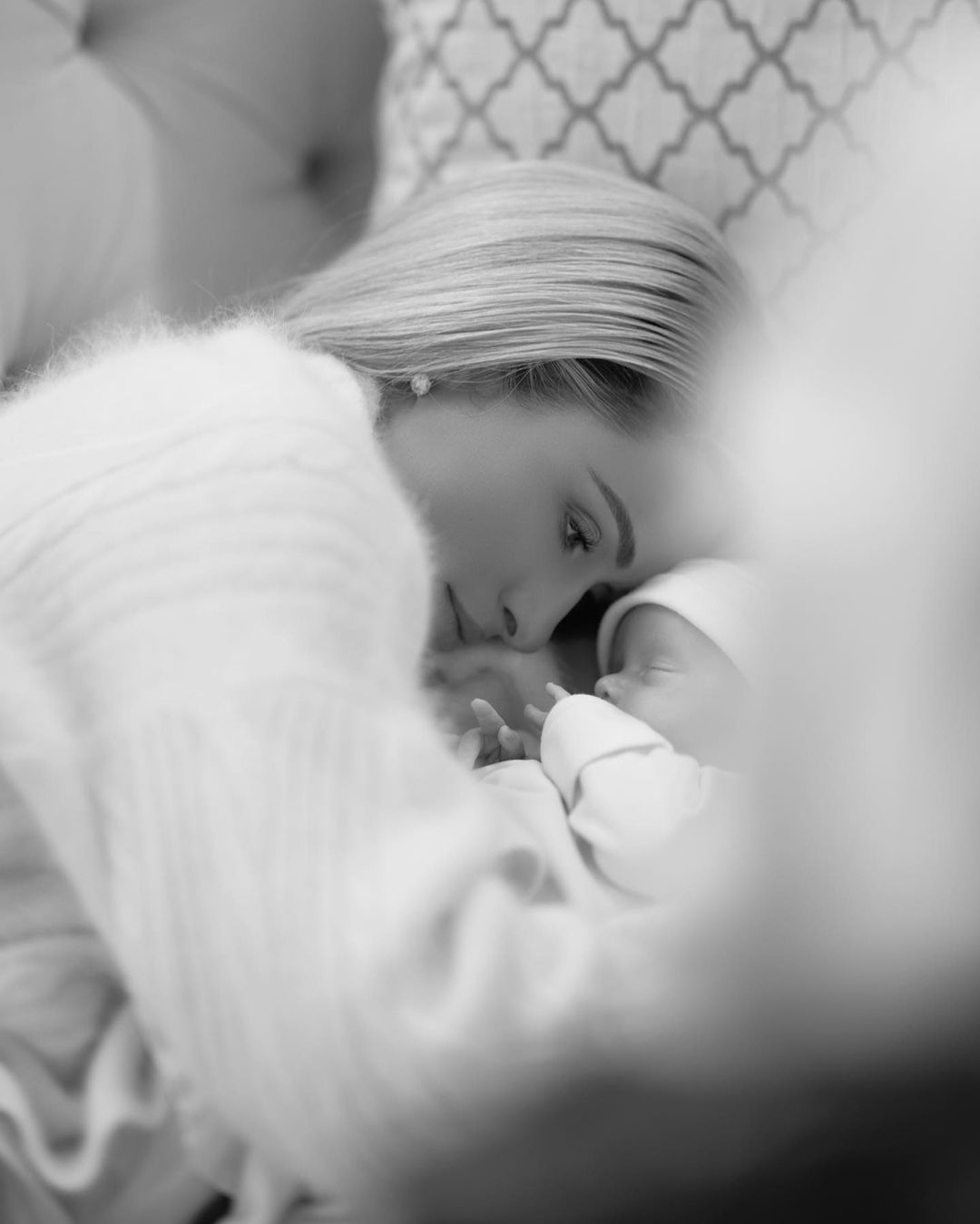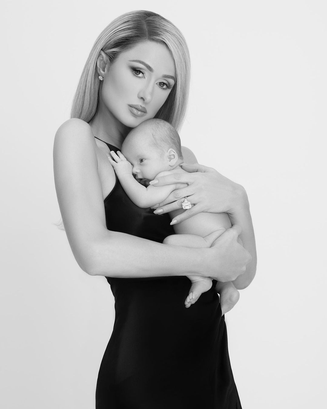 Американская светская львица Пэрис Хилтон, которая в январе этого года впервые стала мамой, показала серию черно-белых кадров со своим малышом. Она держала маленького Феникса на руках и нежно прижимала его к себе.