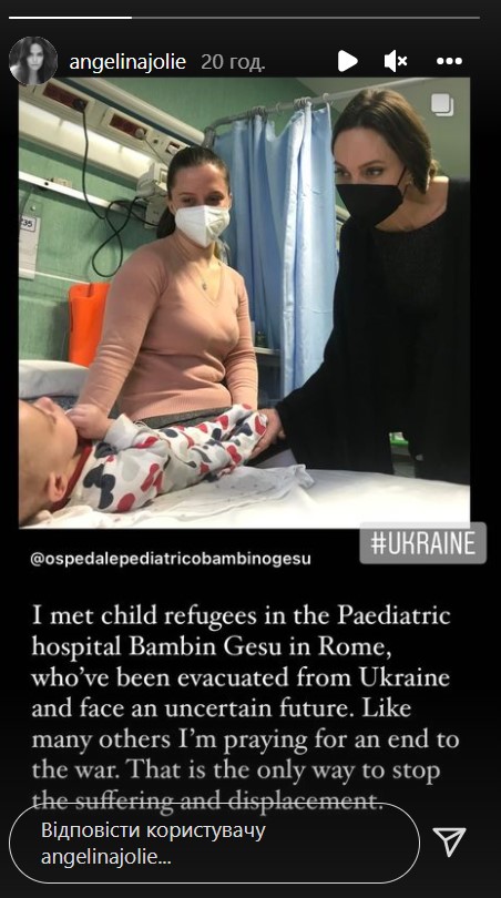 Как посол доброй воли ООН Джоли посетила госпиталь PediatricoBambinoGesu в Риме, где сейчас находятся дети-беженцы из Украины. В своем блоге в Instagram она заявила, что молится об окончании войны.