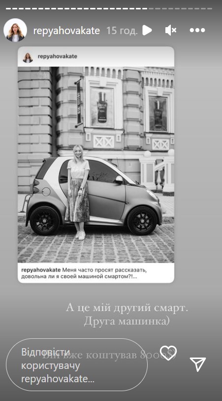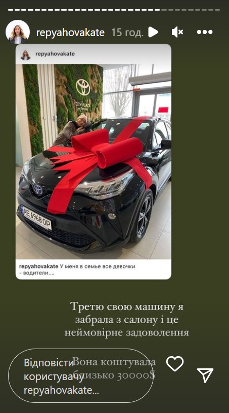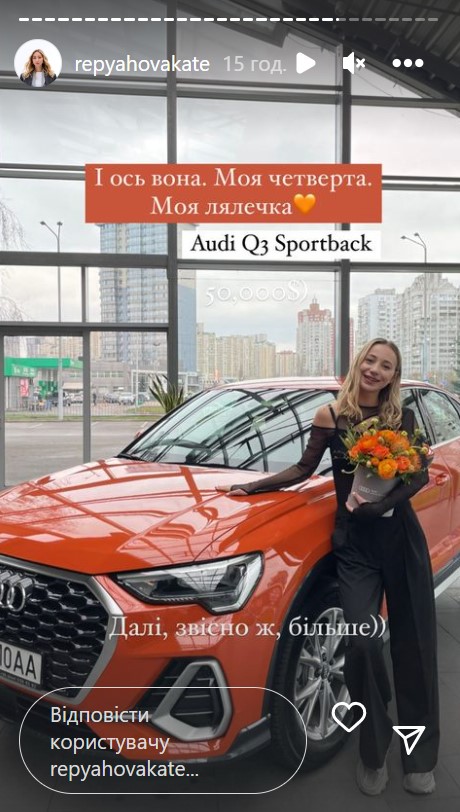 Репяхова также поделилась, что новый внедорожник обошелся ей в 50 тысяч долларов – это около одного 1,8 млн гривен. Девушка не скрывает, что взяла автомобиль в кредит. Первый взнос в размере 60 процентов она уже внесла, тогда как остальную часть планирует выплатить за год. Хотя кредит взяла на три года. Жена Павлика говорит, что будет много и упорно работать весь следующий год, чтобы быстрее попрощаться с задолженностью.