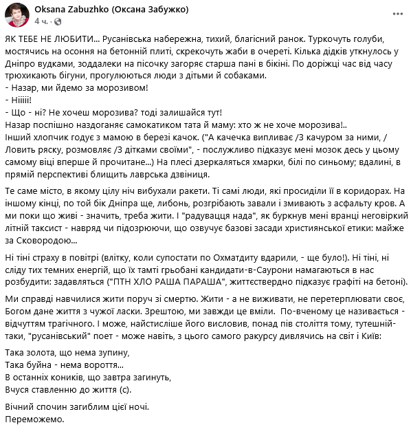 Украинская писательница Оксана Забужко поделилась впечатлениями от утренней атмосферы после вражеской атаки на Киев.