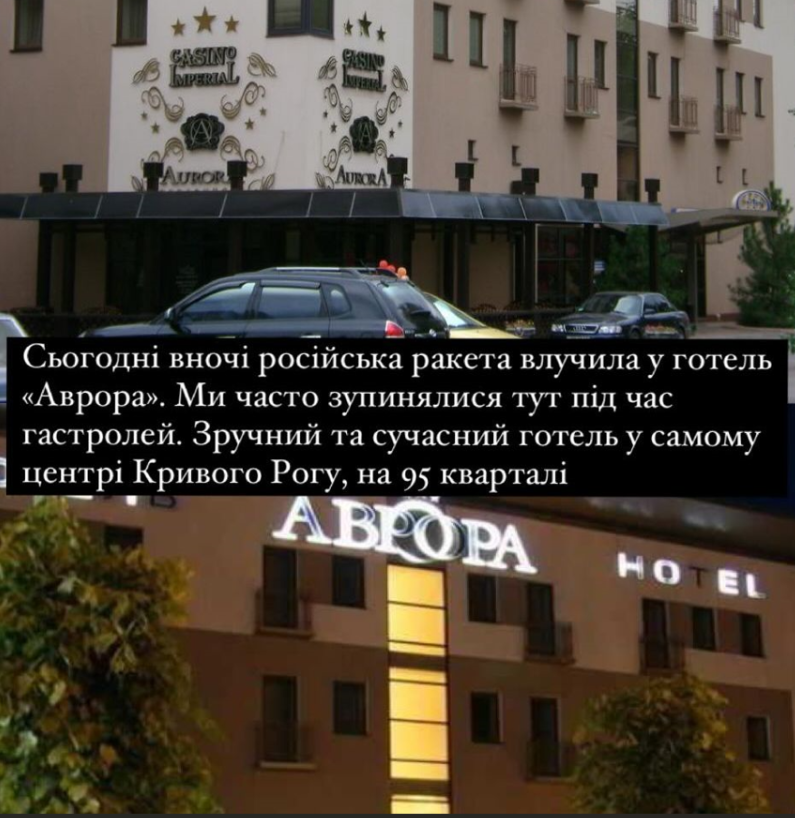 "Сегодня ночью российская ракета попала в отель "Аврора". Мы часто останавливались здесь во время гастролей. Удобный и современный отель в самом центре Кривого Рога, на 95 квартале".