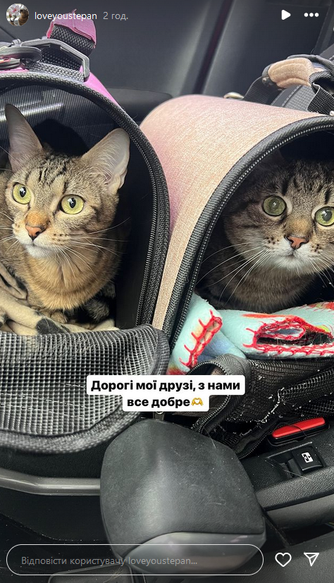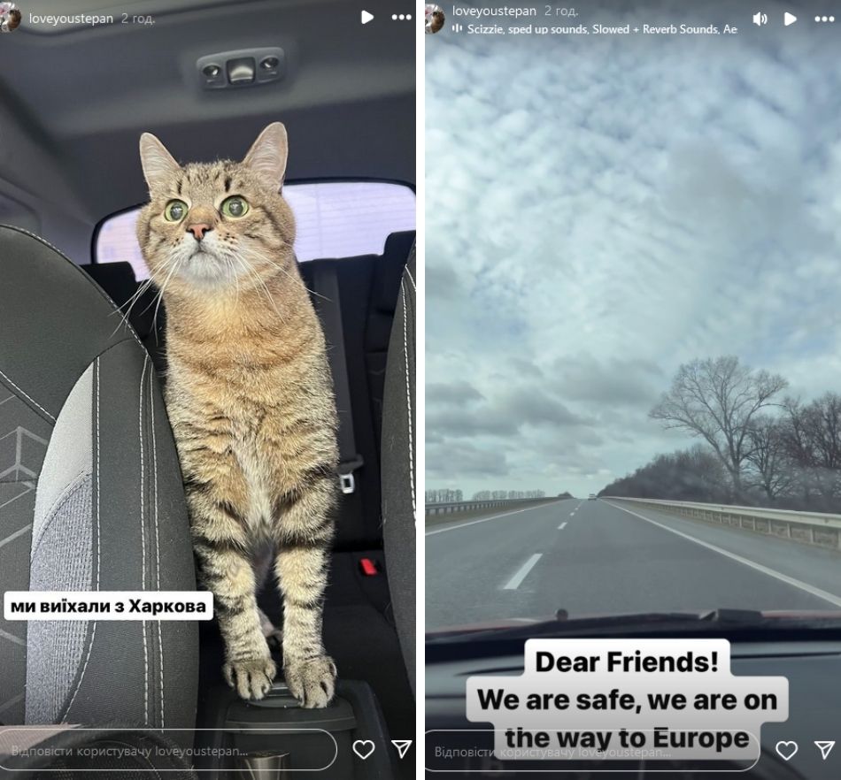 "Дорогие мои друзья, с нами все хорошо, - написал Степан на совместном снимке со Стефанией. - Мы выехали с Харькова". Далее он обратился к своим подписчикам из других стран на английском: "Дорогие друзья. Мы в безопасности, мы на пути в Европу".