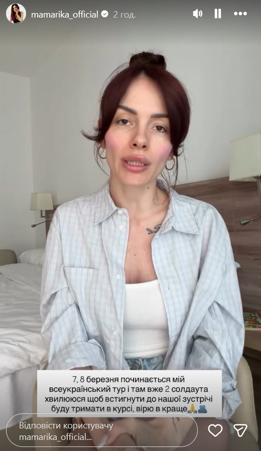 "Еще меня волнует, что 7-8 марта начинается мой всеукраинский тур, в два города - Южноукраинск и Николаев - я боюсь не успеть. Мы делаем все возможное, чтобы мы успели к этому времени доехать. Я вас буду держать в курсе, состоятся ли эти две даты или, возможно, мы их просто перенесем. Там уже два солдаута. Мы рвем все чакры, чтобы выбраться отсюда побыстрее", - заверила она.