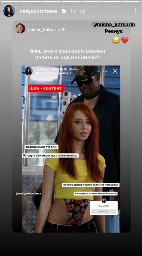 На фото 15-летней давности отреагировал новый бойфренд артистки ресторатор Миша Кацурин. Он поделился кадром в своих stories и написал следующее: "Какого х*ра Деннис Родман пялится на зад моей малышки?".