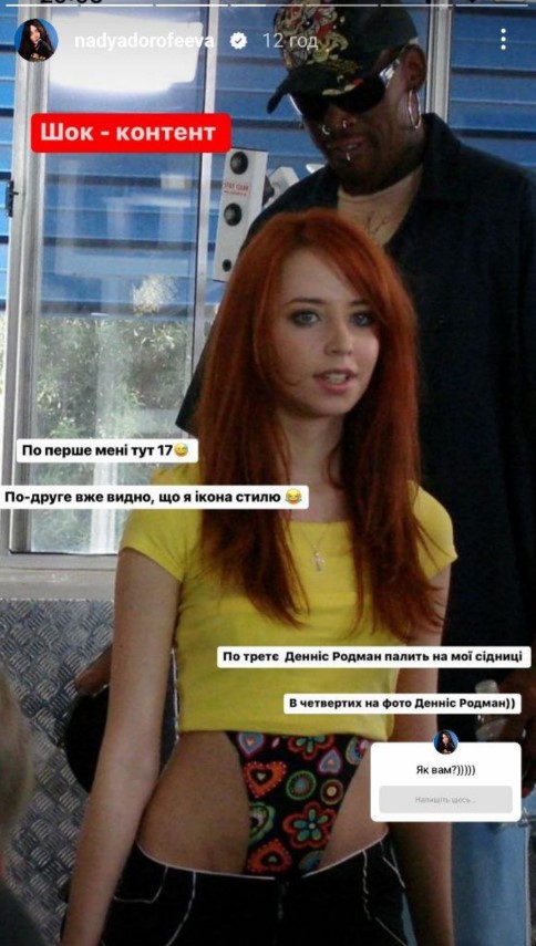 "Шок контент! Во-первых, мне здесь 17. Во-вторых, уже видно, что я икона стиля. В-третьих, Деннис Родман пялится на мои ягодицы. Четвертое: на фото Деннис Родман", - написала артистка в своем блоге в Instagram. На архивном кадре юная певица предстала с рыжими волосами, в желтом топе и черных коротких шортах. Известный американский профессиональный баскетболист Деннис Родман на фото стоял сзади Дорофеевой.