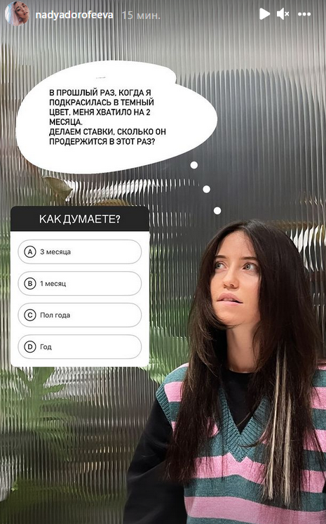 Впрочем, сама Дорофеева не уверена, что долго продержится в образе брюнетки. "В прошлый раз, когда я красилась в темный цвет, меня хватило на два месяца. Делаем ставки, сколько он продержится в этот раз?", - устроила певица в "сториз" опрос.