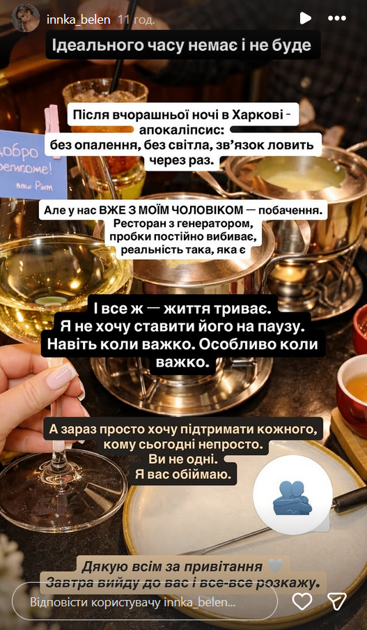 "После вчерашней ночи в Харькове - апокалипсис: без отопления, без света, связь ловит через раз. Но у нас с мужем уже свидание. Ресторан с генератором, пробки постоянно выбивает, реальность такая, какая есть. И все же - жизнь продолжается. Я не хочу ставить ее на паузу. Даже когда трудно. Особенно когда трудно", - пояснила Инна.