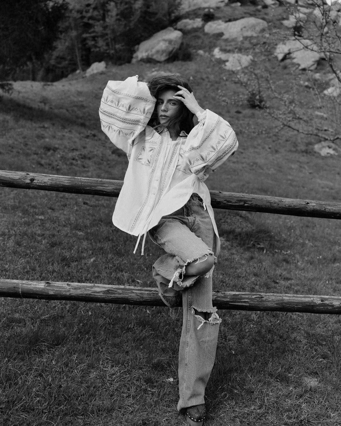 На одном из опубликованных в Instagram кадре артистка предстала в вышитой рубашке с широким поясом в зоне талии, а на другом – в вышитой рубашке, которую соединила с джинсами.