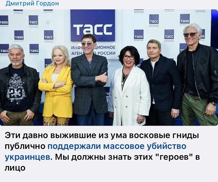 Недавно украинский журналист Дмитрий Гордон опубликовал пост, в котором жестко высказался о звездах-рашистах. Он также показал их фото: в кадре позировали Олег Газманов, Лариса Долина, Григорий Лепс, Николай Басков, Надежда Бабкина и Александр Маршал. Об этих "героях" не стал молчать и украинский исполнитель Потап (настоящее имя – Алексей Потапенко). Музыкант пригрозил им личной расправой за поддержку преступного режима кремлевской власти.