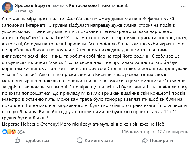 "Я не собирался ничего писать! Но больше не могу смотреть на эту фальшь, которая заполонила интернет! 15 декабря произошло действительно очень печальное историческое событие в украинском песенном искусстве, похороны легендарного певца, народного артиста Украины Степана Гиги! Кто-то из творческих побратимов смог приехать попрощаться, а кто-то нет, потому что были на то определенные причины. Все прошло бы незаметно, если бы те, кто не приехал во Львов, не начали с Степаном выкладывать старые фото и под ними выписывать всякую чепуху и делать себе пиар на горе его семьи. Особенно это касается столичных "звезд", хотя среди них я не припомню ни одного, кто был бы коренным киевлянином", - написал он.