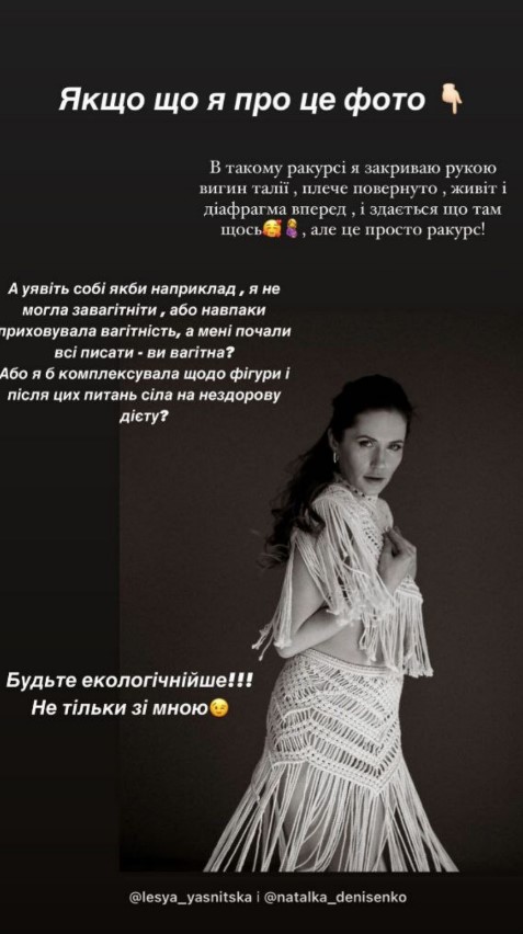"В таком ракурсе я закрываю изгиб талии, плечо повернуто, живот и диафрагма вперед – и кажется, что там что-то. Но это просто ракурс! А представьте себе, если бы, например, я не могла забеременеть или, наоборот, скрывала беременность. А вы начали мне все писать "Вы беременна?". Или я бы комплексовала по поводу фигуры и после этих вопросов села бы на нездоровую диету? Будьте экологичнее!" – обратилась Наталка к своей аудитории.