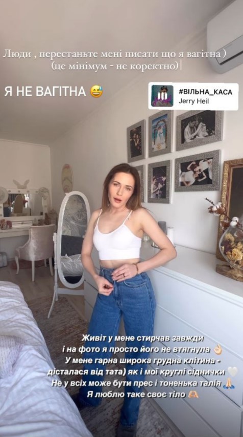 "Люди, перестаньте мне писать, что я беременна. Это как минимум – некорректно. Я не беременна. Живот у меня торчал всегда, и на фото я просто его не втянула. У меня хорошая широкая грудная клетка – досталась от папы, как и мои круглые ягодицы. Не у всех может быть пресс и тоненькая талия. Я люблю такое свое тело".