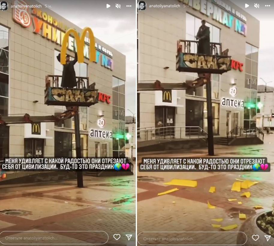 Шоумен отметил, что этот 9-секудный ролик расскажет о россиянах больше, чем любое социологическое исследование. "И смех за кадром и фраза: "Вот и нєт мака", и подход вандалов даже к обычному демонтажу. И прощание с одним из символов окончания железного занавеса, когда в 1990 году открыли первый мак в Москве. И теперь "вот и нєт мака" как символ возвращения этого занавеса, да еще и с кровавым вкусом", - написал ведущий.