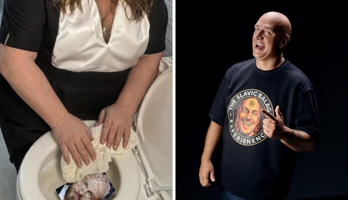 На кадрах, опубликованных в Instagram нового проекта Потапа Slavic Balagan, который артист активно развивает за рубежом, Могилевская "протирает" сиденье унитаза, внутри которого лежит фото Влада Ямы, а Полякова "позирует" в сценическом бикини и с короной на голове.