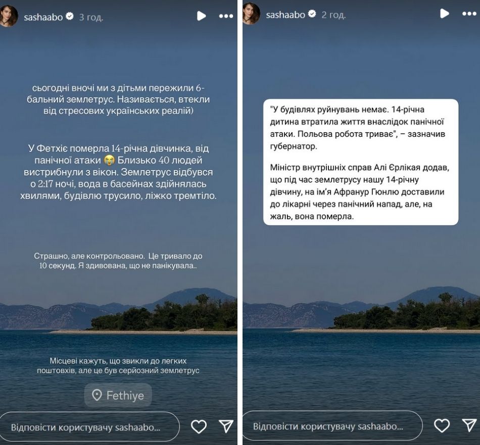 О пережитом инфлюенсерка и многодетная мама рассказала у себя в Instagram-историях. Судя по геолокации, которую она указала в одной из "сториз", Саша Бо находится в курортном городе Фетхие, жители и гости которого ночью 3 июня ощутили толчки магнитудой 6 баллов.