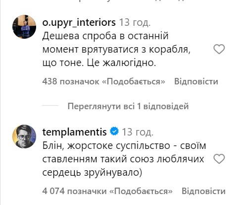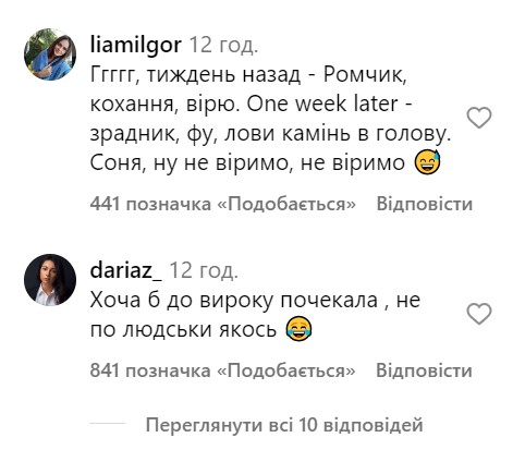 Пользователи сети бурно отреагировали на новость Сони о расторжении помолвки с Романом Гринкевичем. Большинство пользователей пишут о том, что на такой шаг девушке следовало бы решиться еще в первые дни появления коррупционного скандала, а не только тогда, когда ГБР сообщило о подозрении Игорю Гринкевичу и его сообщникам. theLime собрал некоторые комментарии под постом Морозюк, их вы можете увидеть ниже: