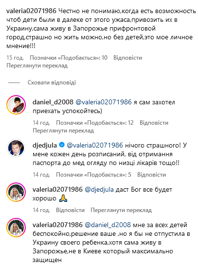 "Мне за всех детей беспокойно, решение ваше, но я бы не отпустила в Украину своего ребенка, хотя сама живу в Запорожье, не в Киеве, который максимально защищен", - продолжила подписчица. "Ну поэтому и приехал", - написал в ответ 15-летний Даниэль.