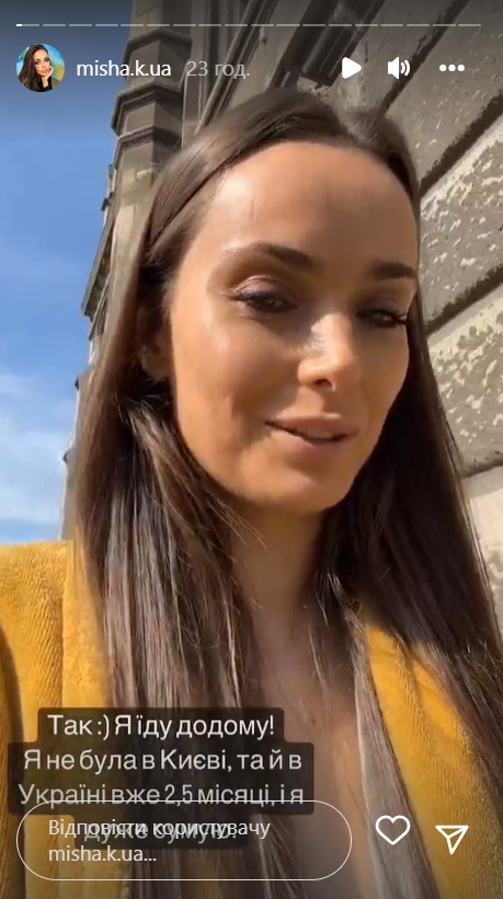 В Instagram-stories знаменитость поделилась, что возвращается в Украину, потому что имеет здесь неотложные дела. "Да. Я еду домой! Я не была в Киеве, да и в Украине уже 2,5 месяца и я очень скучаю" – сказала Мишина.