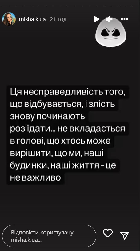 В следующих stories знаменитость поделилась воспоминаниями о прошлой жизни, которая была до войны. Она призналась, что для нее до сих пор остается непонятным, как в 21 веке кто-то может так нагло приходить и решать за других их судьбу, забирая дома и жизни.
