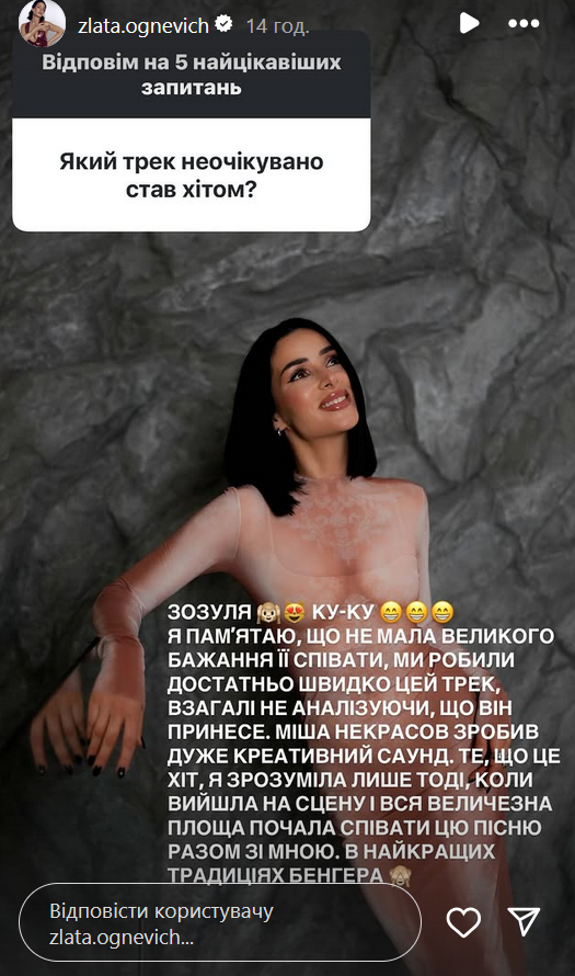 Об этом артистка рассказала в Instagram-историях, отвечая на вопрос подписчицы: "Какой трек неожиданно стал хитом?".