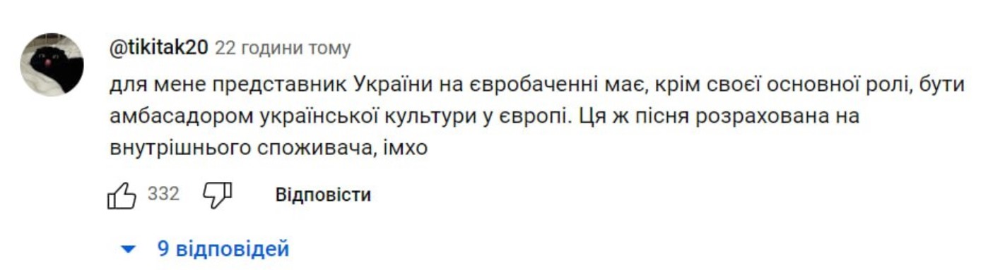 "Для украинского радио. Но не формат "Евровидения", а мы должны думать, как будем выглядеть там. Забирайте в свой плей-лист, но голосуйте сознательно", "Для меня представитель Украины на "Евровидении" должен, помимо своей основной роли, быть послом украинской культуры в Европе. Эта же песня рассчитана на внутреннего потребителя", "Хит в пределах границ Украины, рассчитана на украинскую аудиторию", - пишут пользователи сети.