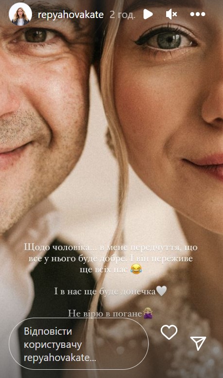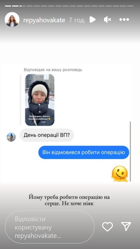 В июле, после обследования, выяснилось, что музыкант родился с пороком сердца. Чтобы исправить ситуацию, ему необходимо поставить искусственный клапан. Также, ранее комментируя эту ситуацию со здоровьем своего мужа, Репяхова писала, что чувствует, что все будет хорошо. Она делилась, что не хочет верить в плохое и планирует в будущем еще хочет родить дочь от любимого человека.