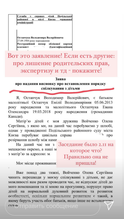 Войченко рассказала, что бывший муж хотел провести ей психиатрическую экспертизу, и к ней домой приходили работники соцслужбы - проверить, в каком помещении живут дети и как они питаются. На вопрос о том, будет ли судебное заседание, чтобы отобрать у Елены детей, Войченко ответила, что "иск подан". Также она заявила, что во время брака они ходили вместе к психотерапевту, и тот поставил Остапчуку "диагноз".