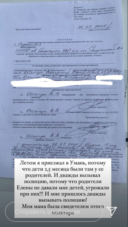 Остапчук назвал ложью заявления Елены Войченко, опубликовав несколько банковских выписок с переводами средств за октябрь 2020 года. Также он утверждает, что в октябре перечислил Елене 42 тыс. грн, чтобы она поехала с детьми на море, но бывшая жена этого так и не сделала.