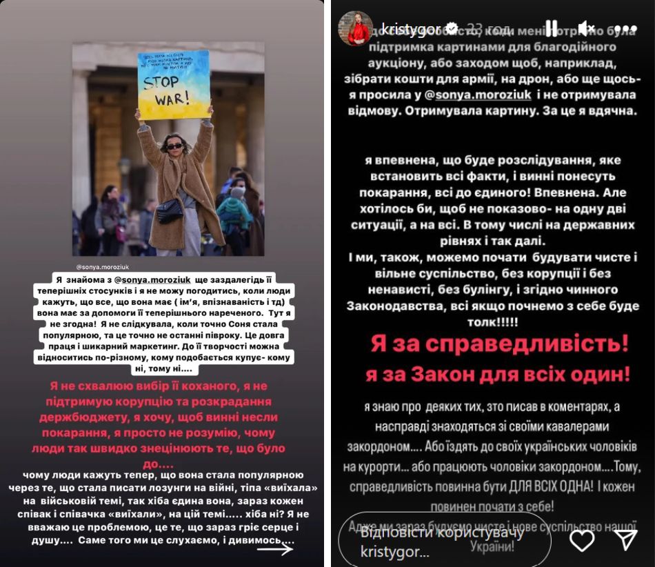 В период взлета популярности 24-летняя Морозюк сотрудничала со многими украинскими знаменитостями и блогерами. Большинство из них сегодня молчат о скандале или осуждают коррупционеров. Однако блогер и бывшая жена Владимира Остапчука Кристина Горняк неожиданно встала на ее защиту.
