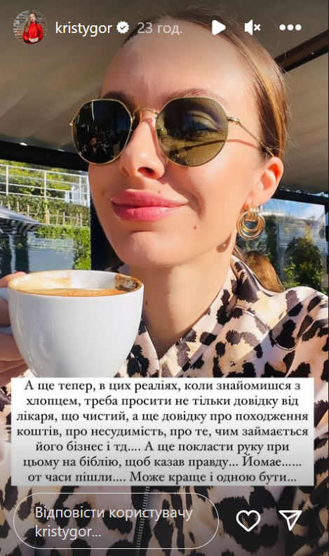 Также Кристина посетовала, что люди ныне любят "хайп, хейт и грязь", и что теперь не так легко знакомиться с богатыми мужчинами: "В этих реалиях, когда знакомишься с парнем, нужно просить не только справку от врача, что чистый, а еще справку о происхождении средств, о несудимости, о том, чем занимается его бизнес. А еще положить руку при этом на Библию, чтобы говорил правду. Вот времена пошли. Может лучше и одной быть".