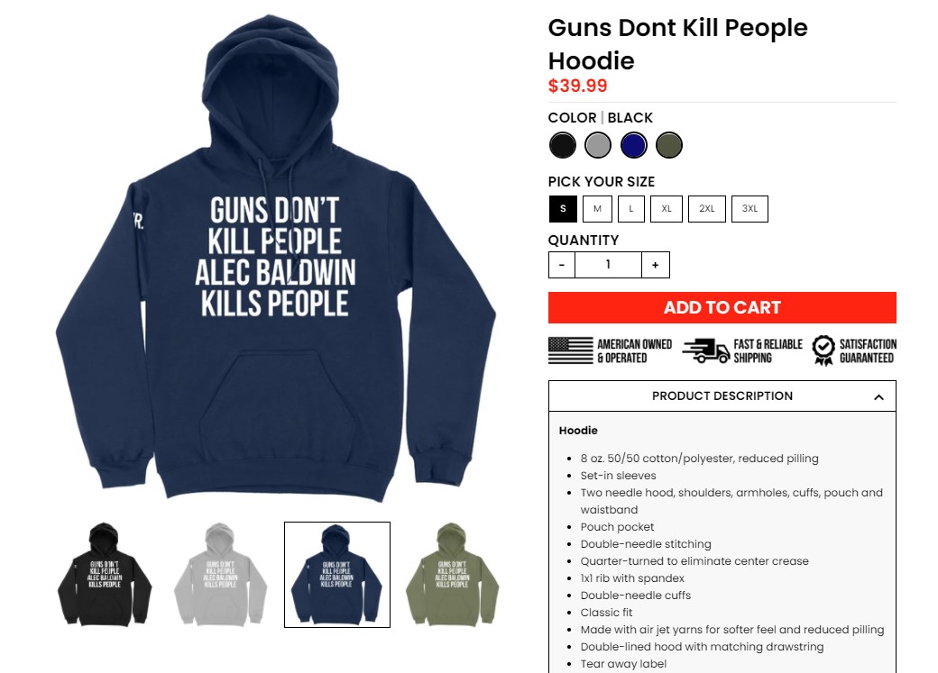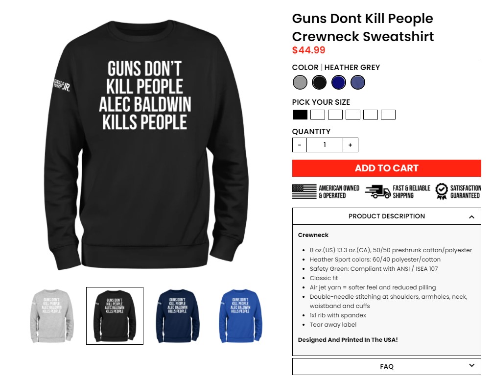 Мерч с соответствующим дизайном появился на официальном сайте Трампа-младшего всего через несколько дней после того, как актер Алек Болдуин на съемках вестерна "Ржавчина" случайно застрелил оператора и ранил режиссера из реквизитного оружия. В нем по неустановленной на данный момент причине оказались боевые патроны.