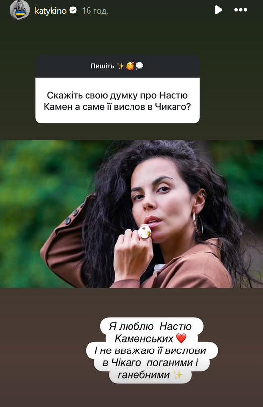 Об этом звезда сериала "Коханні та полум'я" заявила в Instagram-историях, отвечая на вопросы подписчиков об отношении к артистке, в частности к ее скандальному заявлению. "Я люблю Настю Каменских. И не считаю ее высказывания в Чикаго плохими и позорными", - написала она.