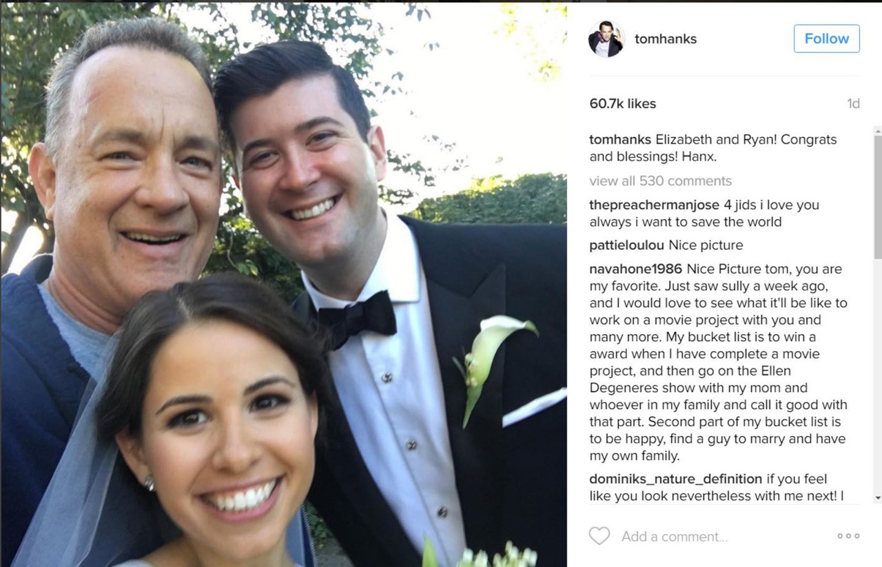 Том Хэнкс не впервые устраивает сюрприз молодоженам. В 2016 году он удивил жениха и невесту в Центральном парке Нью-Йорка, а в 1993 году во время съемок фильма "Форрест Гамп" поздравил пару из Южной Каролины.