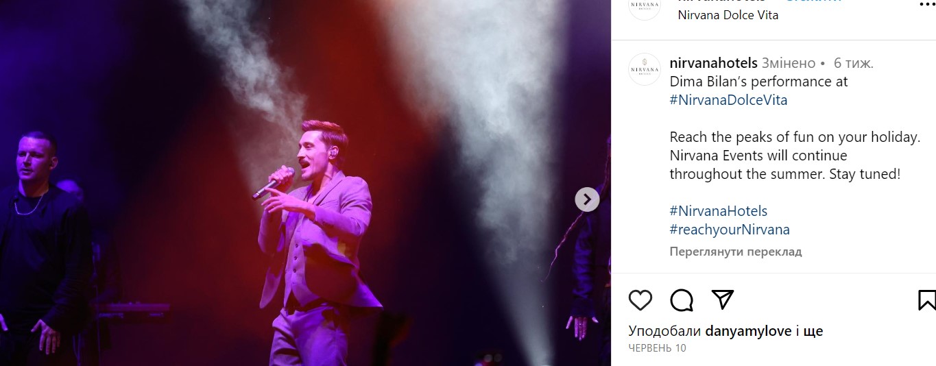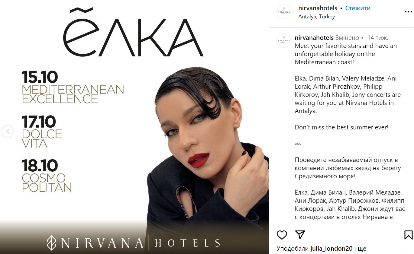 Если зайти на страницу сети гостиниц Nirvana в Instagram, там можно найти афиши выступлений других россиян. В частности, там планируют спеть рэпер Jah Khalib, который сначала выразил солидарность с Украиной, затем выбрал молчание, после чего объявил о гастролях в стране-террористке РФ; российский певец и автор песен азербайджанского происхождения Джонни, молчащий о войне в Украине, который тем самым поддерживает геноцид украинцев; и даже исполнительница Елка (настоящее имя – Елизавета Иванцев), которая родом из Ужгорода. Артистка также выбрала молчаливую поддержку кремлевского режима и продолжает делать вид, будто на ее Родине ничего не происходит.