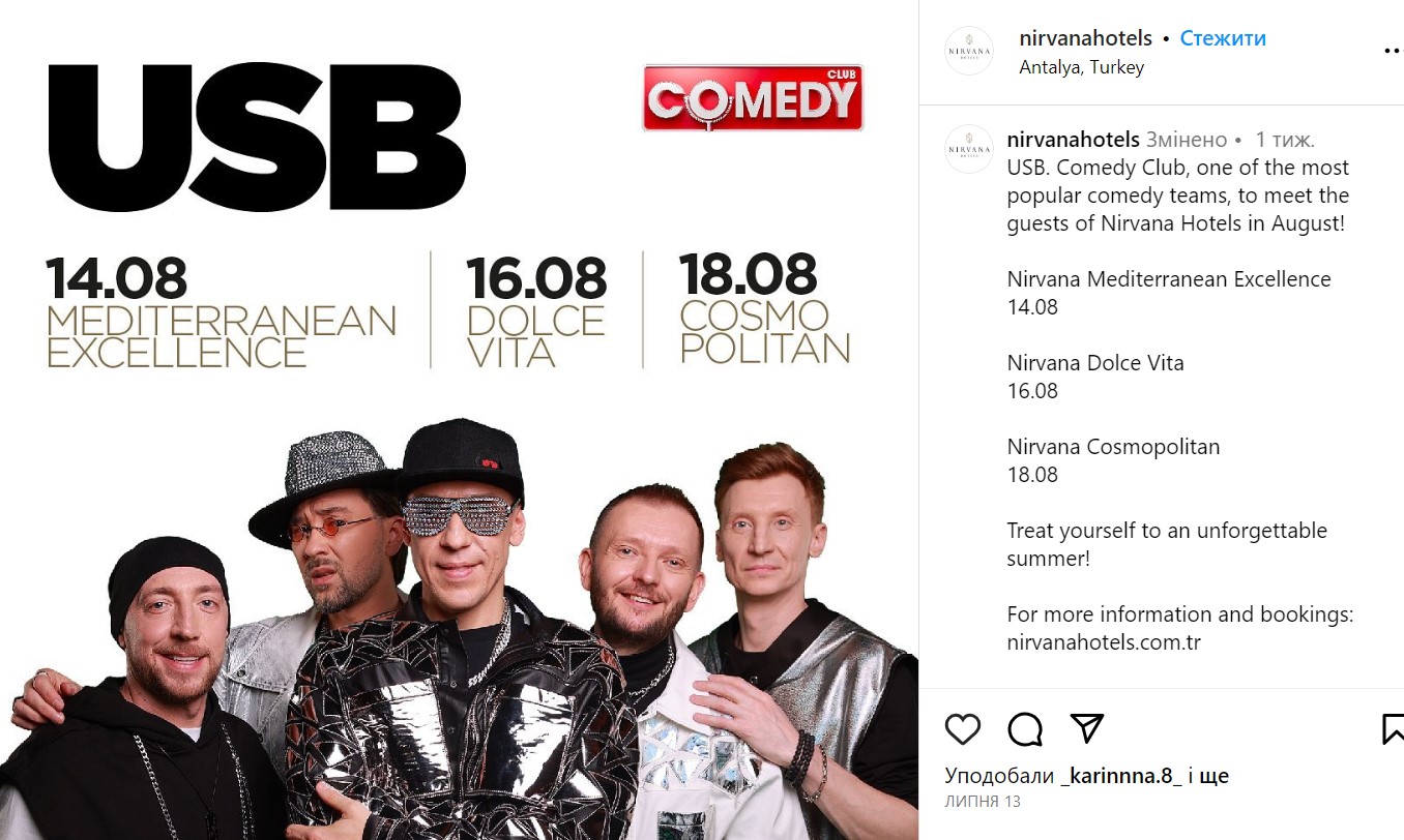 Кроме певцов, в Турцию едут гастролировать и участники российского Comedy Club. Судя по афише, они должны выступить в турецком городе уже в августе и трижды: 14, 16 и 18 числа. Мероприятия запланированы в этой же сети гостиниц, которые, как можно заметить, имеют разные названия, например, Nirvana Cosmopolitan, Nirvana Dolce Vita Nirvana и та же Nirvana Mediterranean Excellence, о которой говорилось в самом начале.