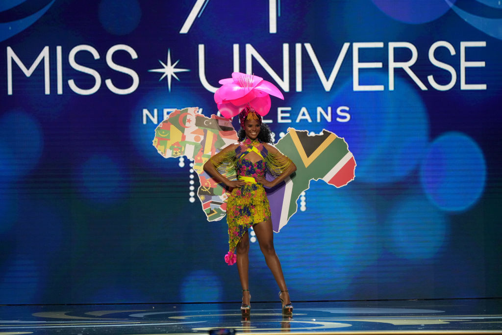 "Мисс Южная Африка" Ндави Нокери вышла на сцену с крыльями бабочки, на которых изображен флаг ее страны рядом с флагами других государств контитента.