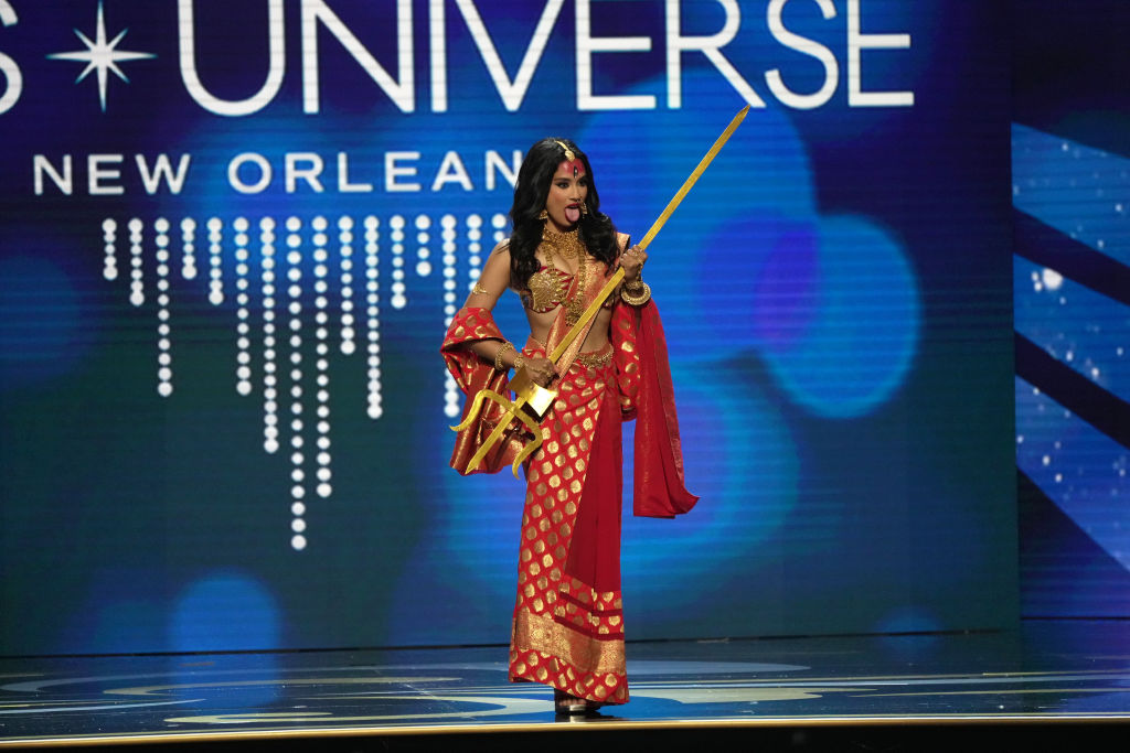 Заметным элементом костюма украинки Виктории Апанасенко стал меч. Примечательно, что не только она выходила на сцену с оружием. Так, "Мисс Непал" София Бхуджель держала в руках тришулу - трезубец, который в Непале и Таиланде является священным оружием. В индуизме тришулу держит в руках Шива - бог разрушения.