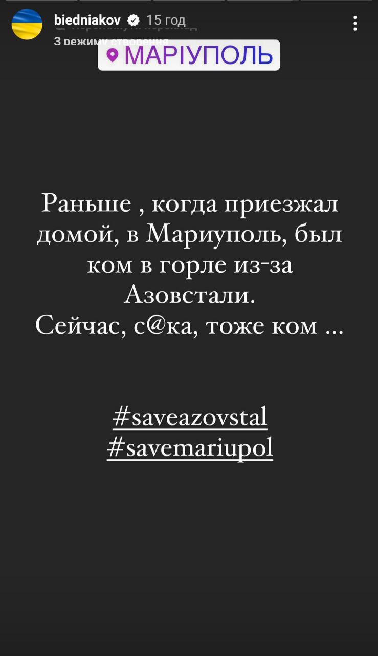 "Раньше, когда приезжал домой, в Мариуполь, был ком в горле из-за Азовстали. Сейчас, с*ка, тоже ком...", - написал телеведущий и добавил хэштеги с призывом спасти Мариуполь и бойцов из "Азовстали".